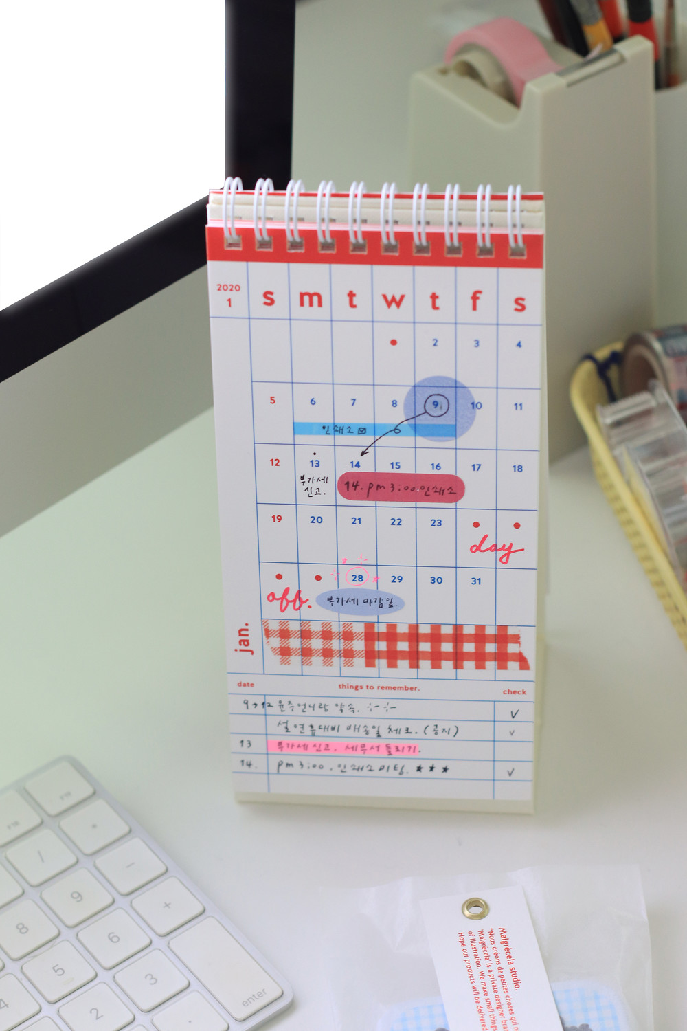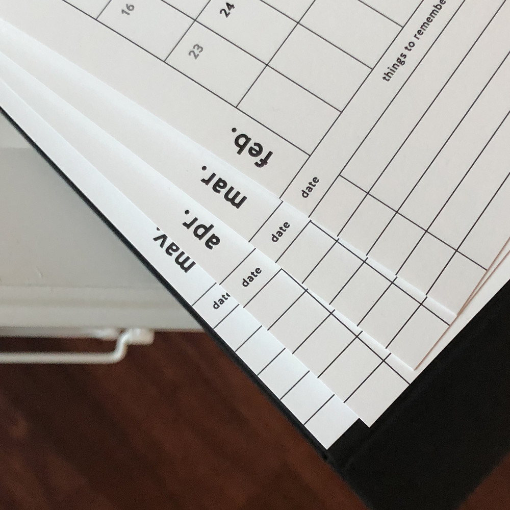 90x180 사이즈의 2020년 데스크 캘린더입니다. 자연스러운 광택이 있는 도톰한 고급종이를 사용하여 제작되었습니다. 약간의 광택이 있으나, 볼펜의 제약은 없어 자유롭게 적으실 수 있습니다. 책상 위에 올려두고 간단하게 일정을 체크하시고 싶은 분들께 추천합니다. “things to remember” 칸을 마련해두어, 중요한 일정을 따로 체크할 수 있도록 하였습니다.