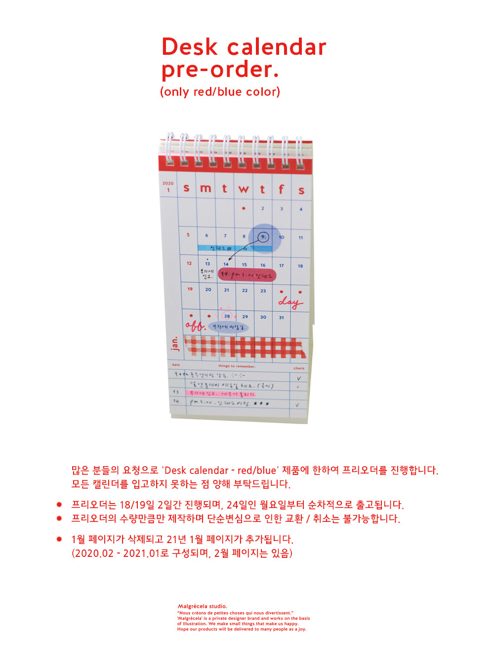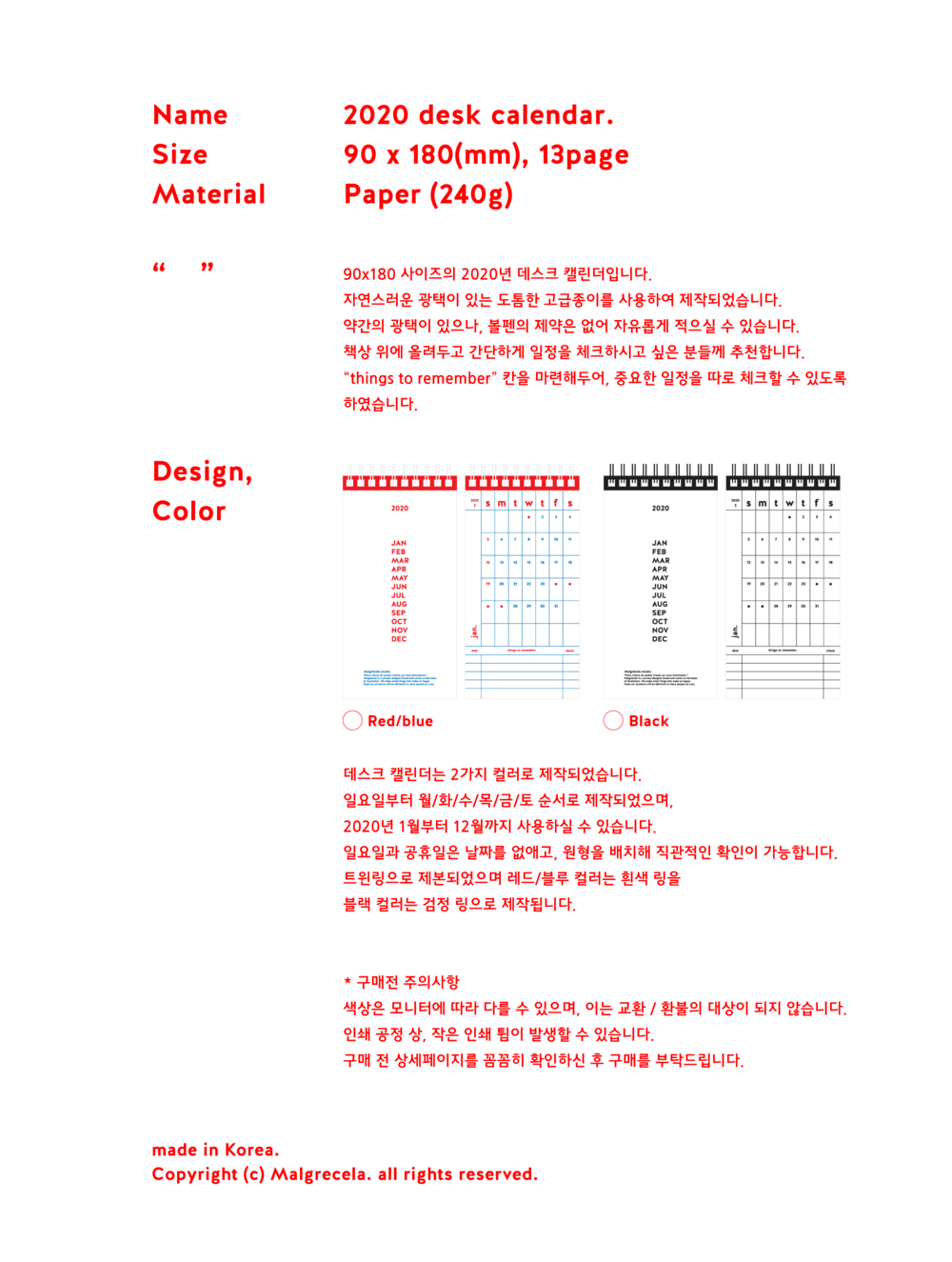 데스크 캘린더는 2가지 컬러로 제작되었습니다. 일요일부터 월/화/수/목/금/토 순서로 제작되었으며, 2020년 1월부터 12월까지 사용하실 수 있습니다. 일요일과 공휴일은 날짜를 없애고, 원형을 배치해 직관적인 확인이 가능합니다. 트윈링으로 제본되었으며 레드/블루 컬러는 흰색 링을 블랙 컬러는 검정 링으로 제작됩니다.