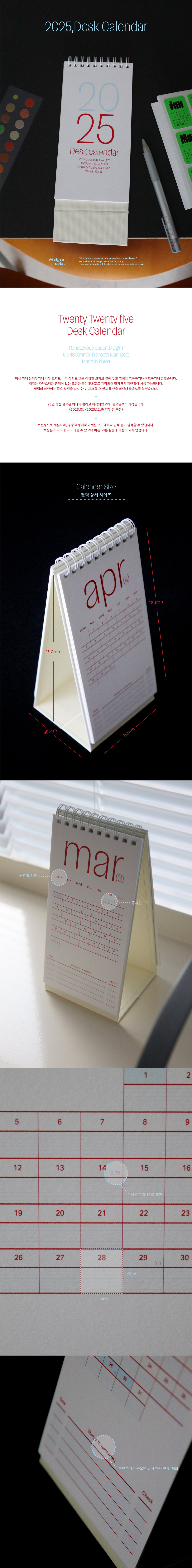 25년 탁상 달력은 하나의 컬러로 제작되었으며, 월요일부터 시작됩니다. (2025.01 - 2025.12,총 열두 달 구성)