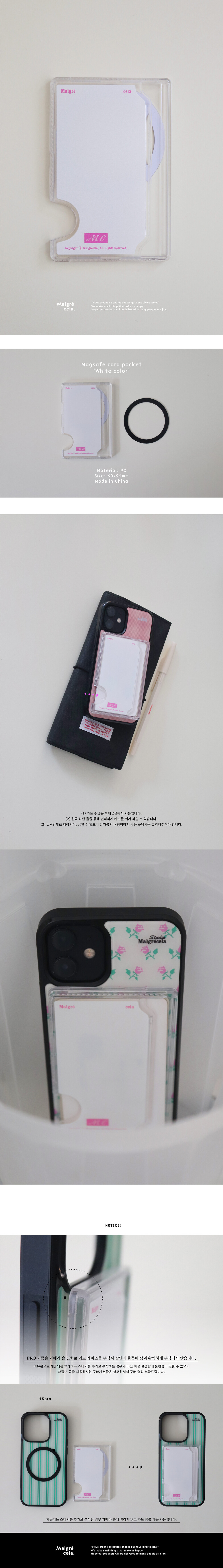 ` 전면 부 하드(PC)+ 자석으로 제작된 카드 수납형 케이스입니다. ` 맥세이프 기능이 있어, 맥세이프 케이스에 부착하여 사용하실 수 있습니다. ` 제작 공정상 센터가 정확히 맞지 않거나, 작은 잉크가 튈 수 있으며 UV인쇄 방식으로 미세한 선이 보일 수 있습니다. ` 알콜 스왑 사용시 인쇄된 부분의 색 변화가 오거나 벗겨질 수 있으니 가급적 사용하지 않는 것이 좋습니다.