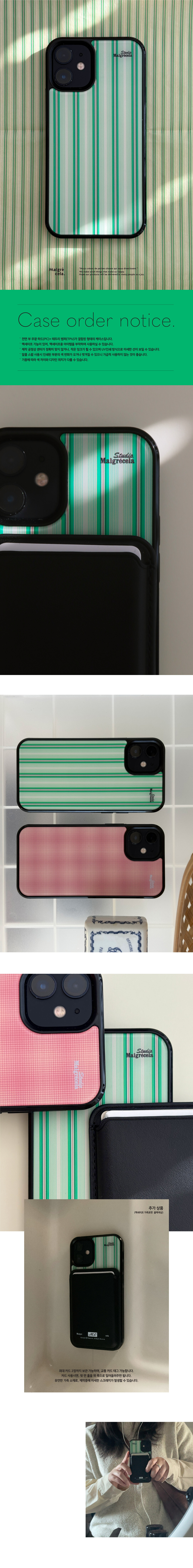 CASE ORDER NOTICE. * 케이스는 제작까지 최대 7일 소요됩니다. 여유로운 일정으로 주문해주시길 바랍니다. * 주문 제작 상품으로 접수 후, 단순 변심/기종 선택 오류/배송 지연으로 인한 교환/환불은 어려운 상품입니다. 이에 동의하시는 분에 한하여 구매 부탁드립니다.