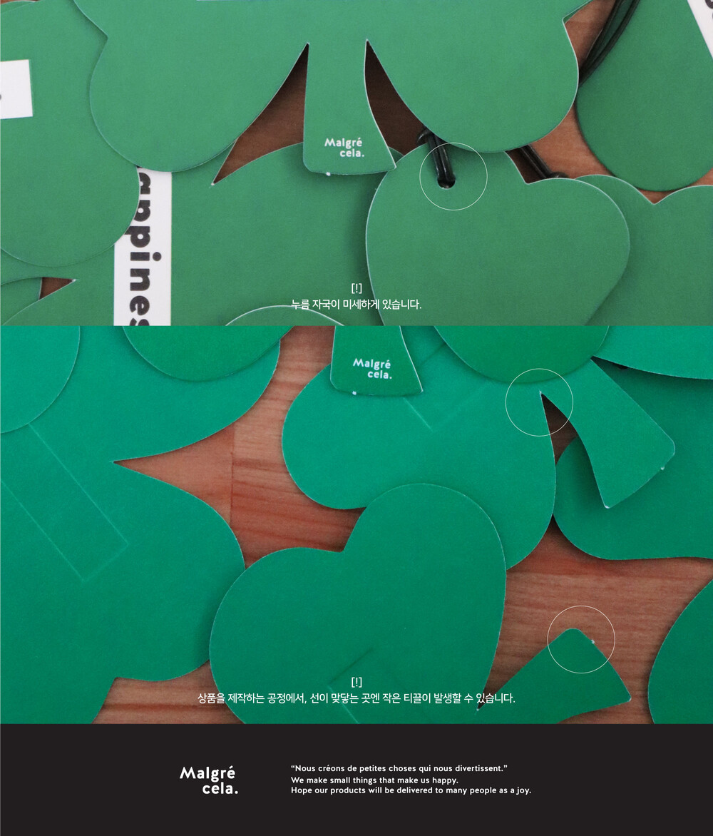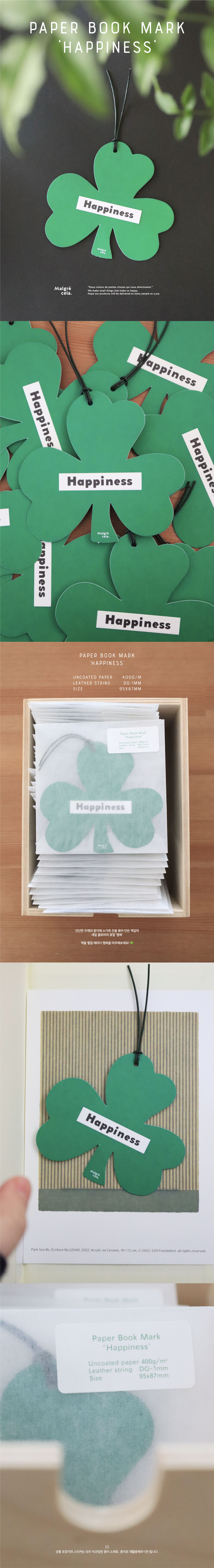 단단한 두께의 종이에 소가죽 끈을 묶어 만든 책갈피, 세잎클로버의 꽃말 '행복'
